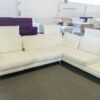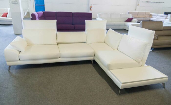 Divano delle linee essenziali, dotato di meccanismo sullo schienale reclinabile in avanti.